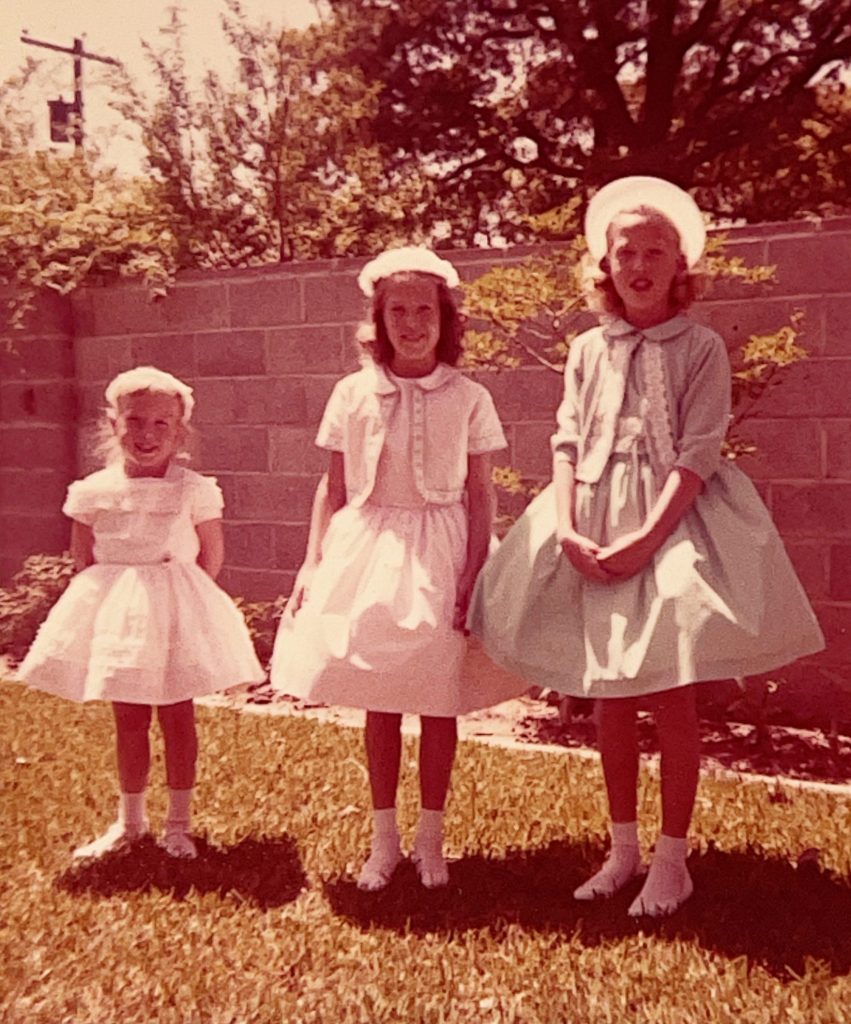 While organizing stacks of family memorabilia, I found a crumpled shirt-box of old photos. Amazingly, the pictures were still in good shape. After flipping through the top layer, I spotted an Easter line-up of me with my two sisters. I laughed and cringed, yet the photo stirred fond memories of Easter holidays.