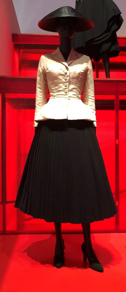 Reflecting on Dior’s impact, his tight waists and full skirts were revolutionary in defining the direction of fashion following WWII. Introduced in 1947, after years of wrenching sacrifices, the folds of luxurious fabric and the crisp tailoring of jackets signaled a return to the days before the war.